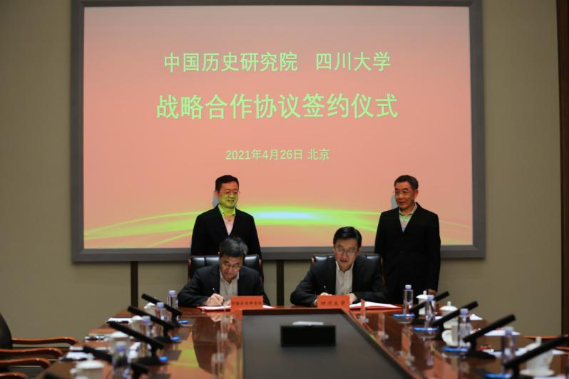 4月26日,四川大学与中国历史研究院战略合作协议签署仪式在中国历史研究院浩然厅举行。中国社会科学院副院长、党组副书记兼中国历史研究院院长、党委书记高翔,中国历史研究院副院长李国强、杨艳秋,纪委书记、副院长路育松;我校党委书记王建国、杰出教授霍巍、副校长姚乐野,及双方相关单位负责人等参加签约仪式。