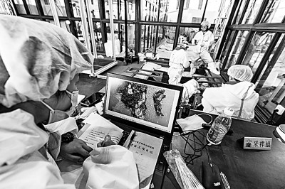 此次四川省广汉市三星堆遗址考古发掘和保护研究充分运用现代科技手段,实现考古发掘、科技考古与文物保护全过程紧密结合。图为考古人员在发掘现场利用电脑查看新发现的象牙雕,并进行记录。